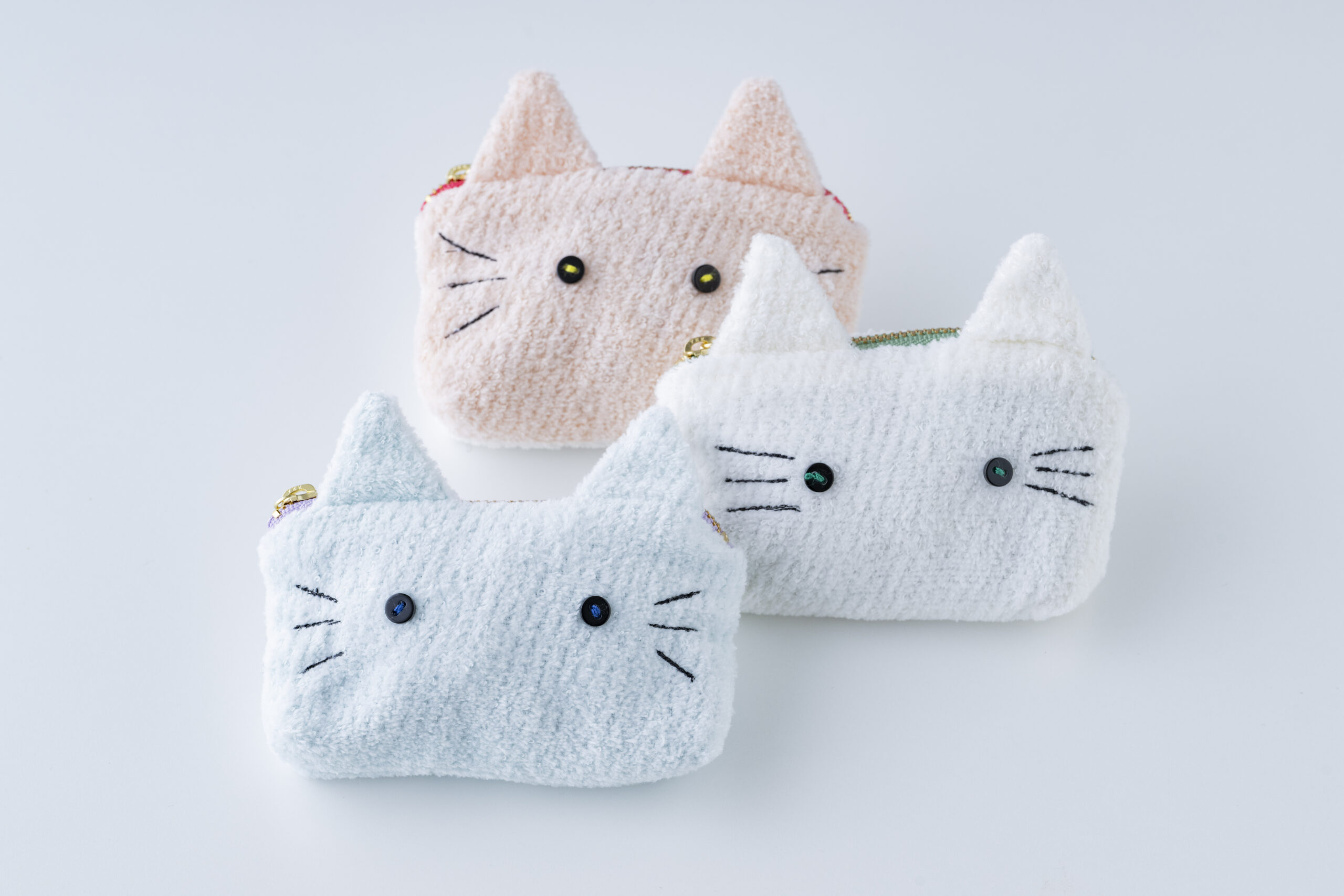 ねこの形のかわいいポーチです。1つ1つ丁寧に作っています。いろいろな柄で作ります。